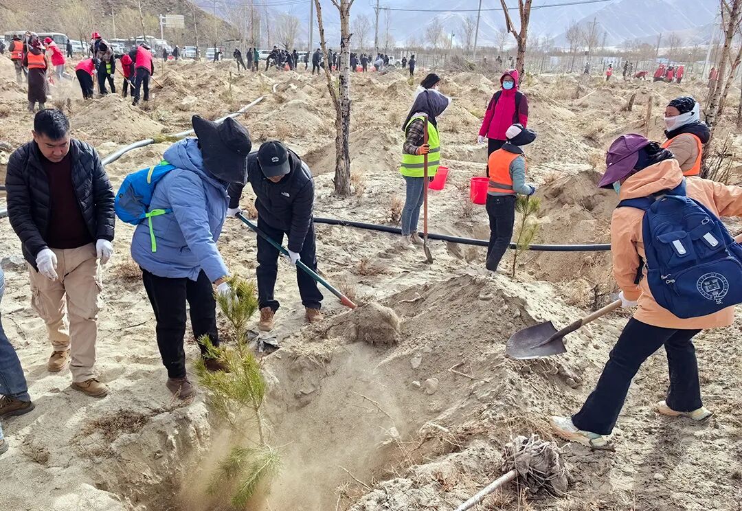 植树现场,大家热情高涨、干劲十足,挖坑扶苗、填土压实、浇水灌溉,各环节衔接有序。新栽的树苗整齐排列、迎风挺立,为春日的拉萨大地增添了勃勃生机,也承载着大家对绿色发展、生态美好的期盼。