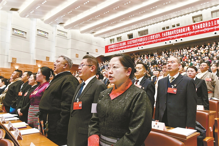 人大代表们神情庄重,齐声高唱国歌。本报记者 旦增兰泽 摄