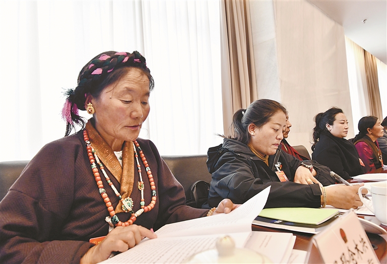 日喀则市代表团分组审议政府工作报告。本报记者 旦增兰泽 摄