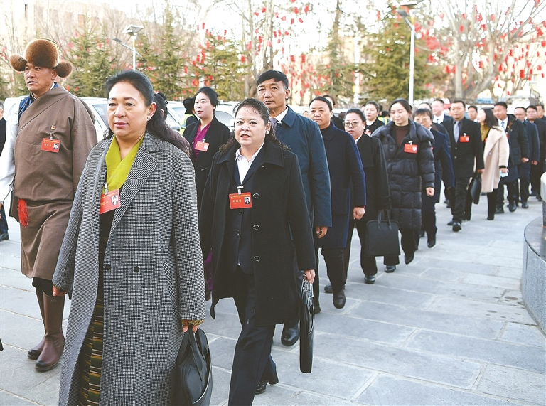 人大代表们精神饱满、意气风发地步入会场。本报记者 洛桑 摄