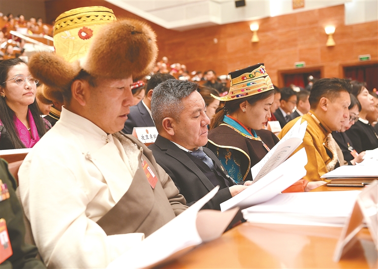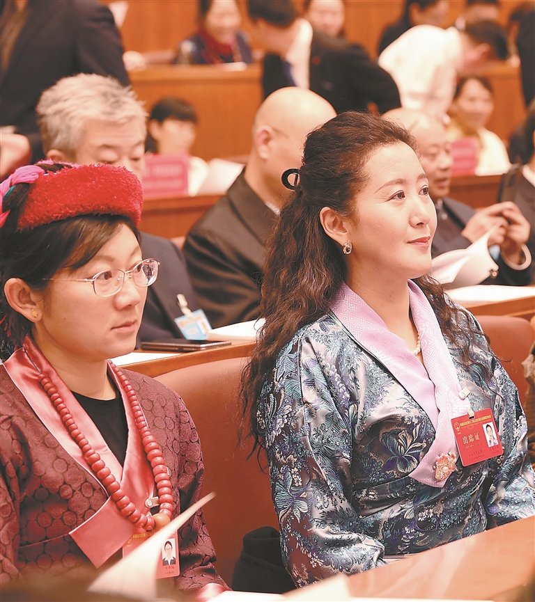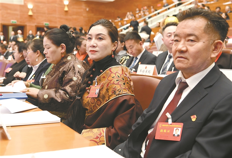 人大代表们认真聆听政府工作报告。 本报记者 洛桑 摄