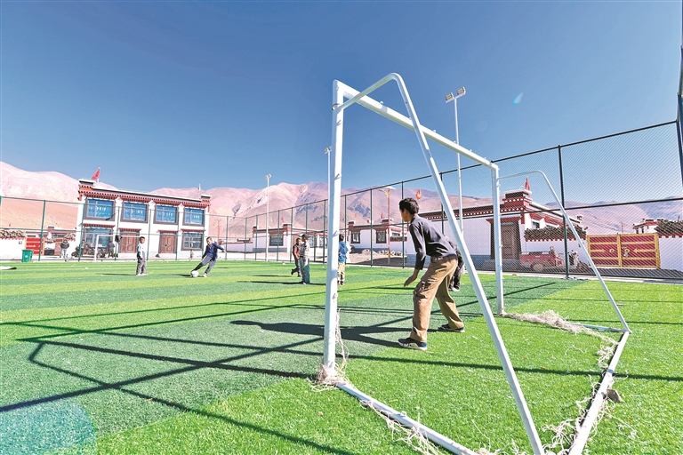 图为定日县长所乡森嘎村新修建的足球场上,孩子们在踢足球。本报记者 旦增嘎瓦 杨子彦 扎西顿珠 摄