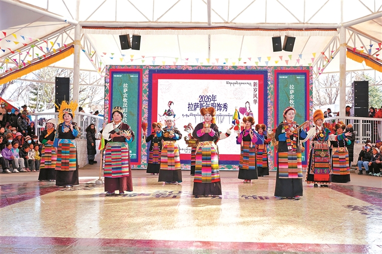 图为2026拉萨新年服饰秀拉萨农牧民妇女代表“村T秀”宗角禄康公园活动现场。