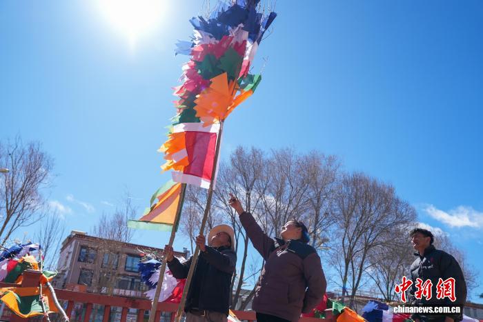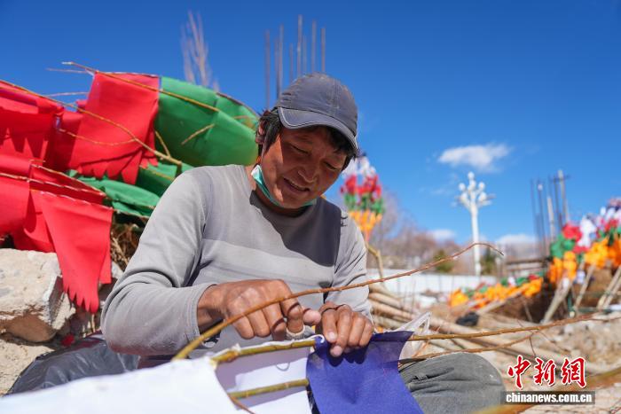 2月5日,临近藏历新年,在西藏自治区拉萨市街头,农牧民正缝制五彩经幡树。五彩经幡树是藏族民众在藏历新年前必备的年货之一。藏历新年期间,藏族民众会选择一个良辰吉日,为自家的房顶更换五彩经幡树,祈求新的一年里五谷丰登,吉祥如意。