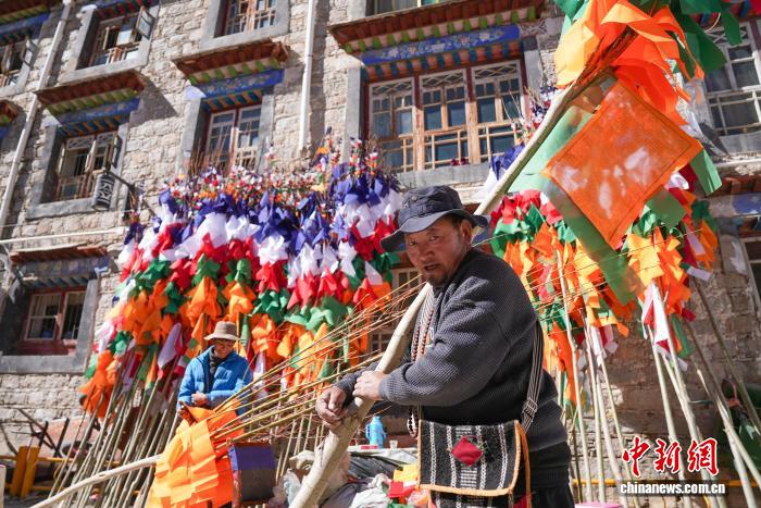图为来自仁布县的格桑扎西扛着五彩经幡树。贡确 摄