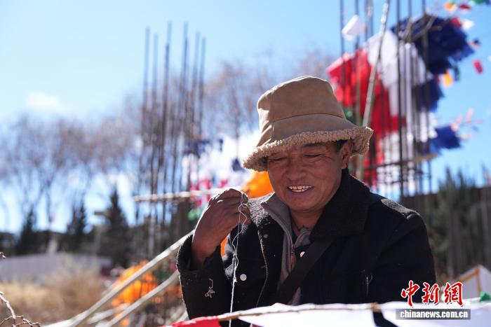 图为格桑扎西正在缝制五彩经幡树。贡确 摄