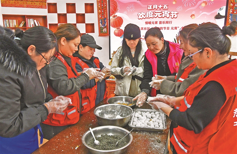 图为拉萨市城关区吉崩岗街道热木其社区群众和社区工作人员正在包汤圆。记者 旦增兰泽 摄