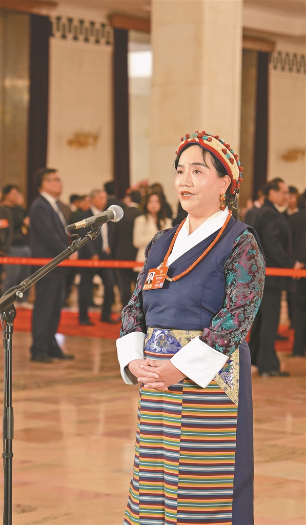 图为3月7日,全国政协十四届四次会议第二场“委员通道”集体采访活动在人民大会堂举行。这是住藏全国政协委员明吉措姆接受媒体采访。本报记者 旦增旺姆 摄