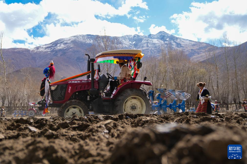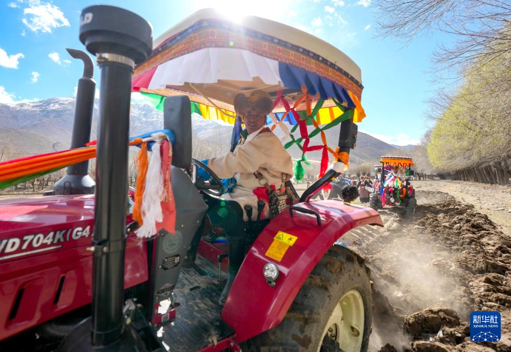3月16日,人们为拖拉机手和撒种子的妇女献上哈达。新华社记者 晋美多吉 摄