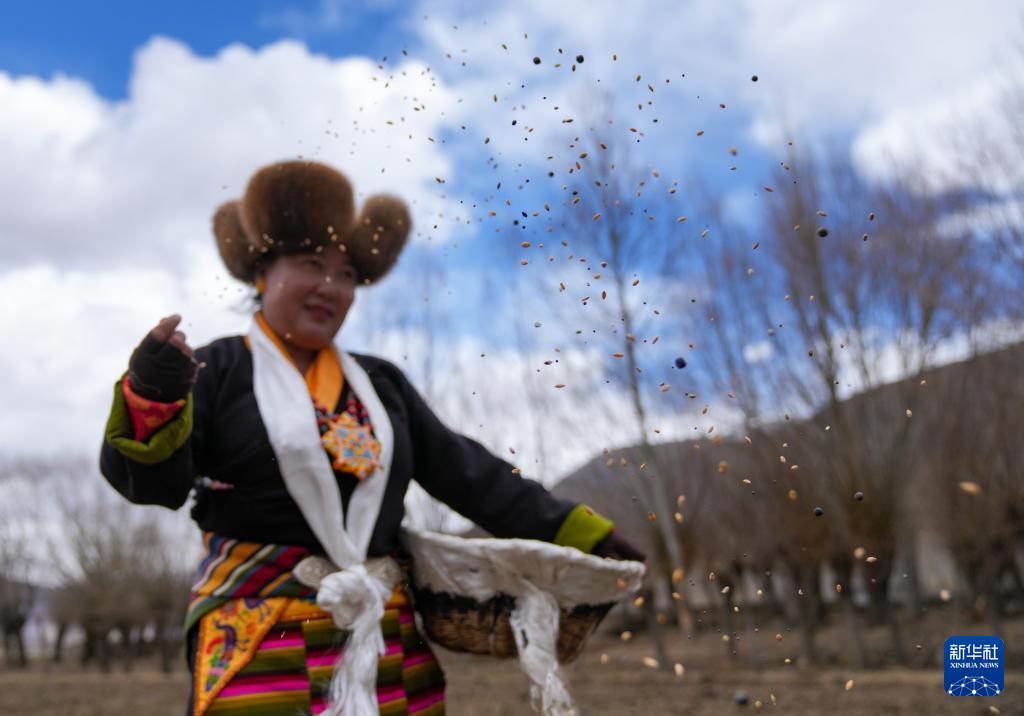 3月16日,西藏山南市结巴乡结巴村村民身着盛装,在新犁开的田地上播撒种子。新华社记者 晋美多吉 摄
