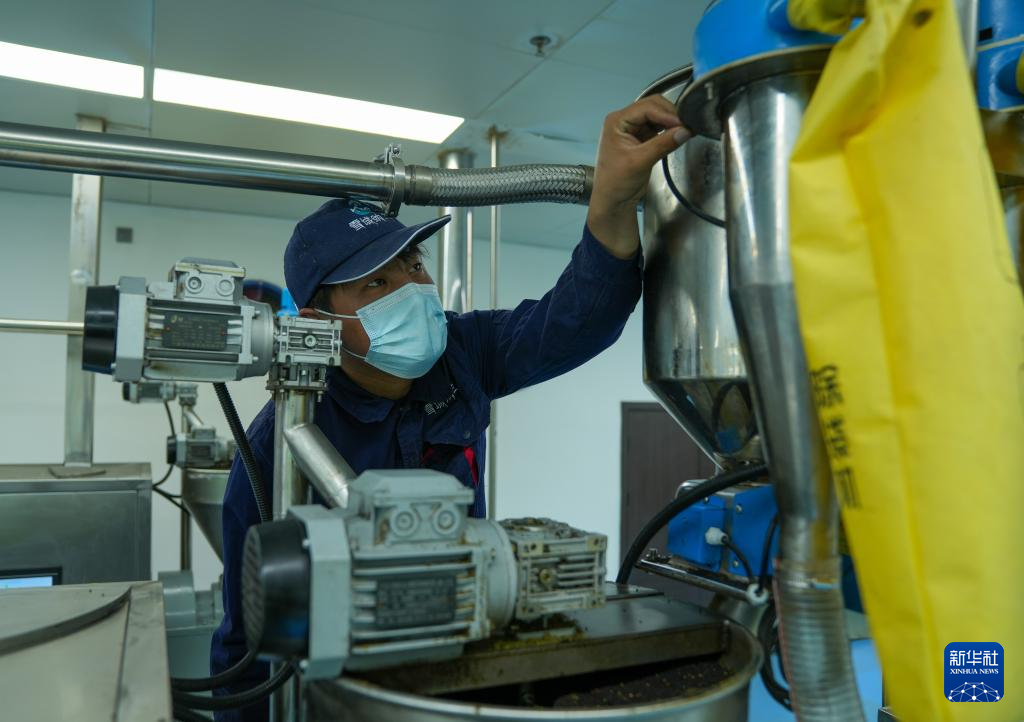 西藏山南市扎囊县重点招商引资企业——西藏纳兰生态产业有限公司工作人员操作微波烘烤设备制作食用油(3月17日摄)。新华社记者 晋美多吉 摄