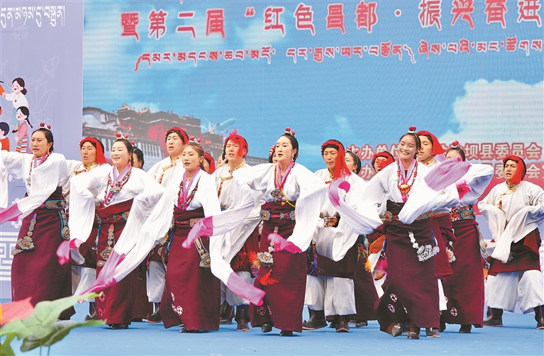3月28日,昌都市边坝县举办纪念西藏百万农奴解放67周年暨第二届“红色昌都·振兴奋进”群众性舞蹈复赛。图为比赛现场。记者 索朗旺久 摄