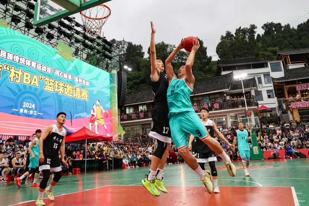 2024年6月9日,第十二届全国少数民族传统体育运动会“同心畅享”系列活动——民族团结“村BA”篮球邀请赛在贵州省黔东南苗族侗族自治州台江县台盘村开赛。瞿宏伦 摄