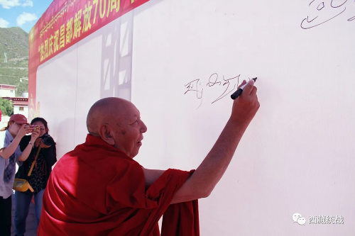 签名仪式开始后,在宗洛·向巴克珠带领下,全寺僧人逐一在“热烈庆祝昌都解放70周年暨感党恩、听党话、跟党走”僧人签名墙上签下了自己的名字,郑重地作出了自己的承诺。