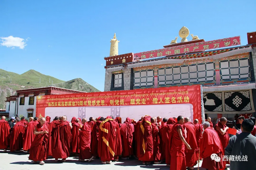 8月26日,昌都市强巴林寺开展“热烈庆祝昌都解放70周年暨感党恩、听党话、跟党走”僧人签名活动。自治区政协副主席、强巴林寺堪布宗洛·向巴克珠,市政协党组成员、强巴林寺管委会党组书记、主任泽仁罗布出席签名仪式,强巴林寺管委会党组副书记、副主任泽它主持仪式并讲话。