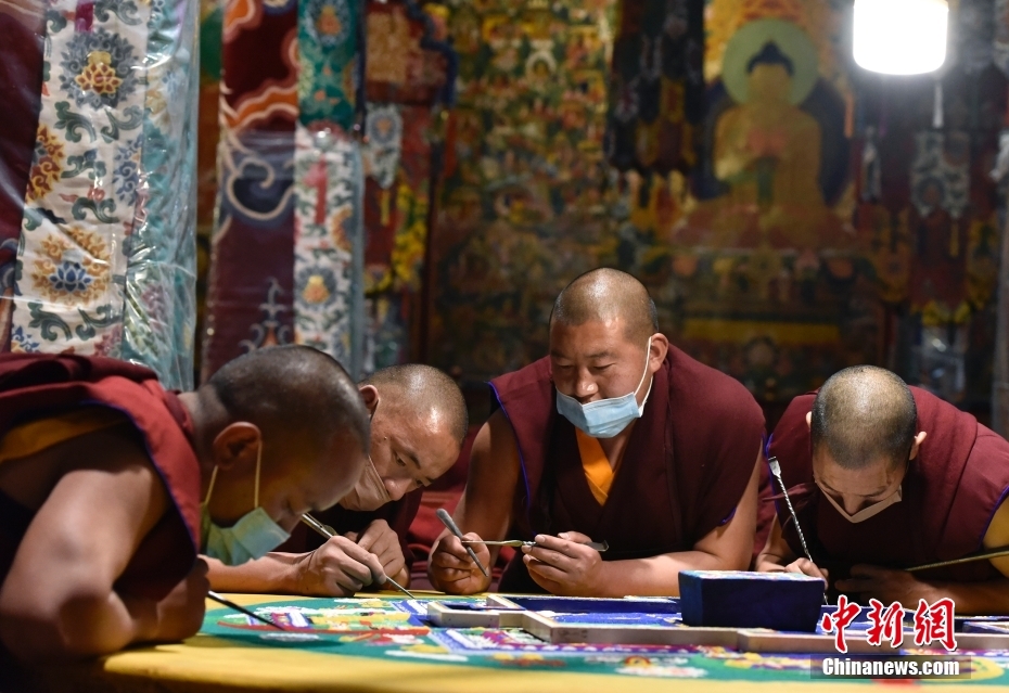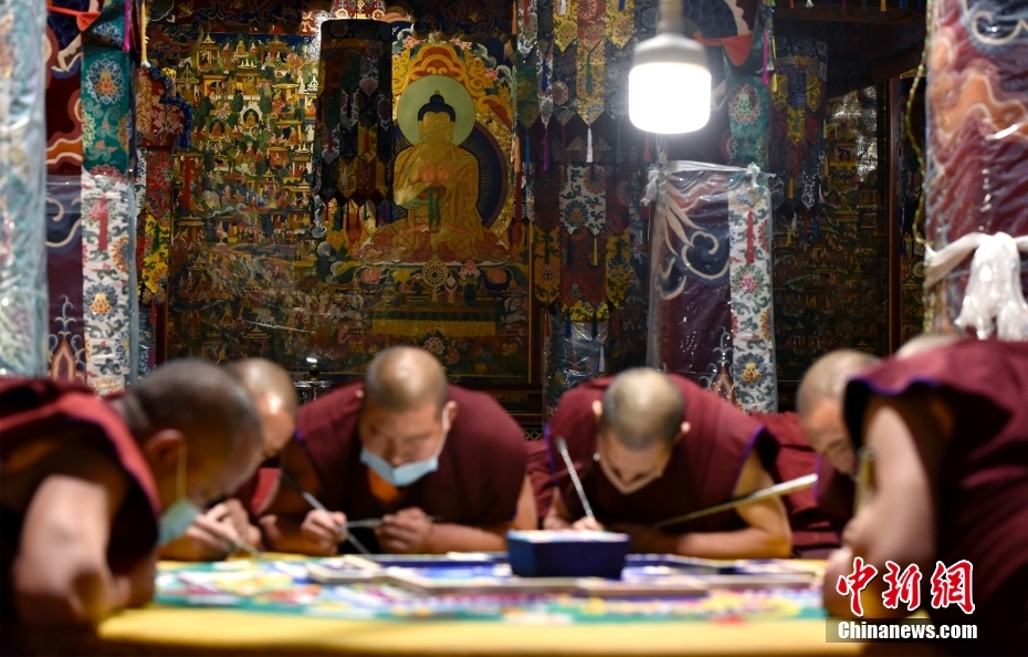 图为功德林寺僧人正在绘制沙画坛城。 中新社发 李林 摄