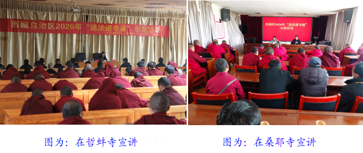 为深入学习贯彻习近平法治思想和习近平总书记关于宗教工作的重要论述,全面落实自治区党委相关会议精神,扎实推进藏传佛教中国化方向,积极引导藏传佛教与社会主义社会相适应,3 月 23 日至 24 日,我区在哲蚌寺、桑耶寺精心组织开展 “送法进寺庙” 主题示范活动。此次活动通过专题宣讲、多元服务、资料发放等多种形式,向广大僧尼普及法律法规知识,切实提升其国家意识、公民意识、法治意识,为推进宗教领域治理现代化筑牢法治根基。